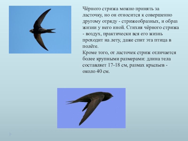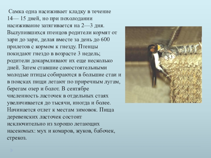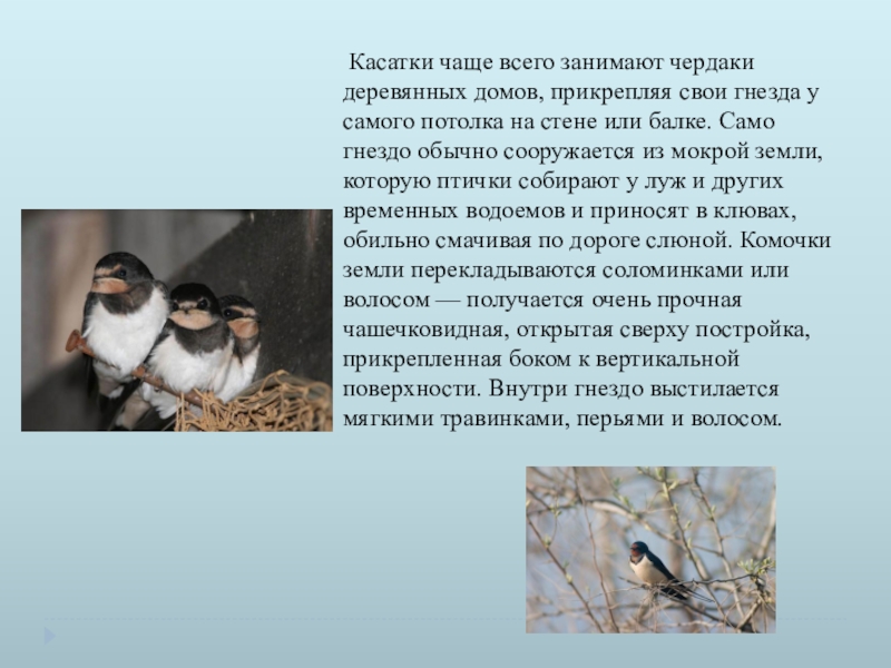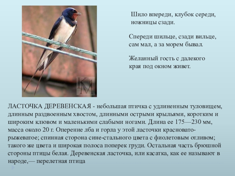 ЛАСТОЧКА ДЕРЕВЕНСКАЯ - небольшая птичка с удлиненным туловищем, длинным раздвоенным хвостом, длинными острыми крыльями, коротким и широким клювом и маленькими слабыми ногами. Длина ее 175—230 мм, масса около 20 г. Оперение лба и горла у этой ласточки красновато-рыжеватое; спинная сторона сине-стального цвета с фиолетовым отливом; такого же цвета и широкая полоса поперек груди. Остальная часть брюшной стороны птицы белая. Деревенская ласточка, или касатка, как ее называют в народе,— перелетная птица
