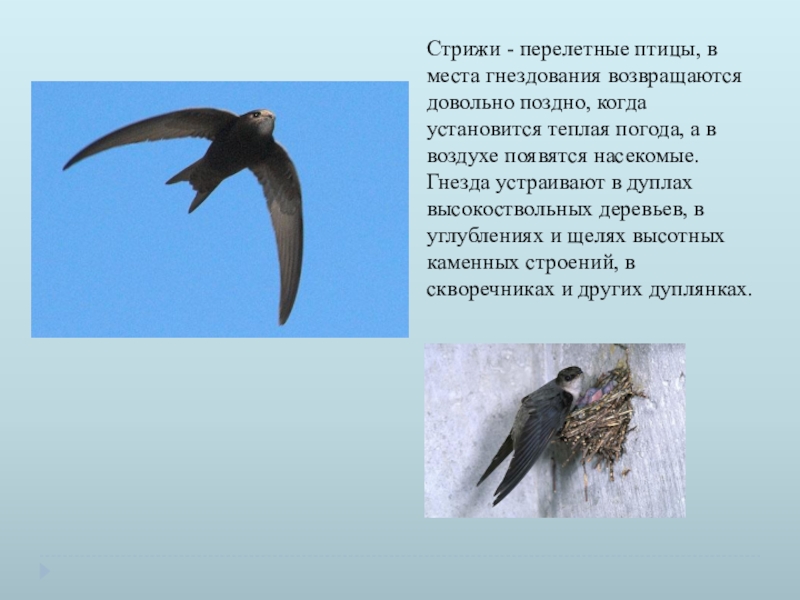 Самцы прилетают на место гнездовья на несколько дней раньше самок, иногда пролетая со скоростью 200 километров в сутки.
