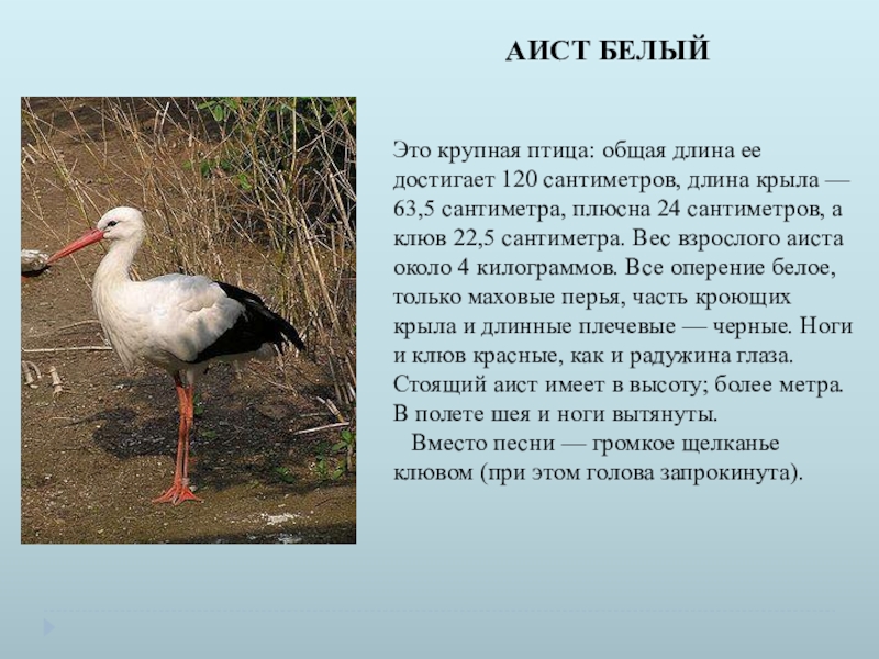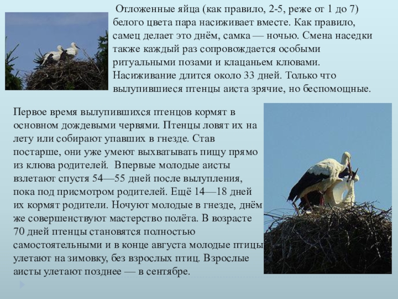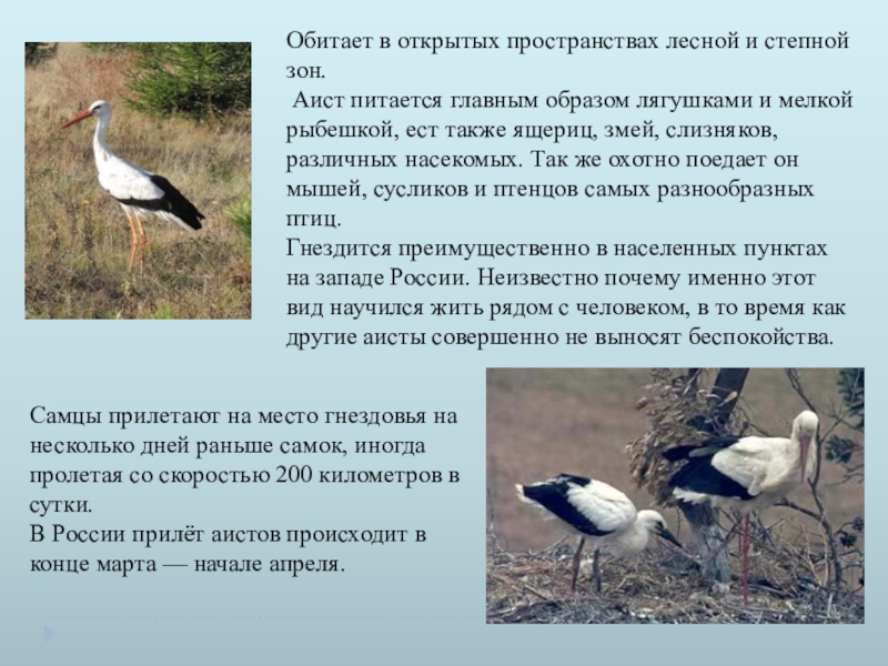В России прилёт аистов происходит в конце марта — начале апреля.