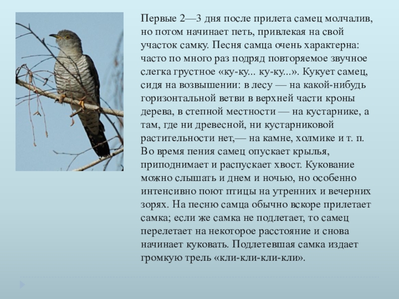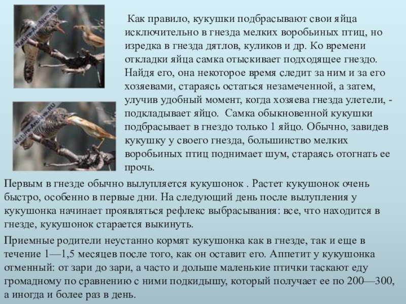Первым в гнезде обычно вылупляется кукушонок . Растет кукушонок очень быстро, особенно в первые дни. На следующий день после вылупления у кукушонка начинает проявляться рефлекс выбрасывания: все, что находится в гнезде, кукушонок старается выкинуть.