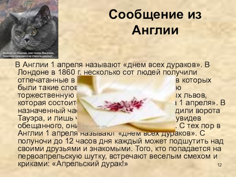 дураков». В Лондоне в 1860 г. несколько сот людей получили отпечатанные в типографии приглашения, в которых были такие слова: «...прибыть на ежегодную торжественную церемонию умывания белых львов, которая состоится в Тауэре в 11 часов утра 1 апреля». В назначенный час толпы приглашенных осадили ворота Тауэра, и лишь через некоторое время, не увидев обещанного, они поняли, что их разыграли. С тех пор в Англии 1 апреля называют «днем всех дураков». С полуночи до 12 часов дня каждый может подшутить над своими друзьями и знакомыми. Того, кто попадается на первоапрельскую шутку, встречают веселым смехом и криками: «Апрельский дурак!»