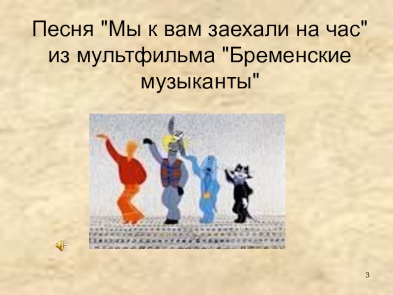 Слайд 3Песня "Мы к вам заехали на час" из мультфильма "Бременские музыканты"