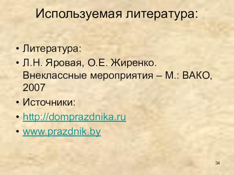 Л.Н. Яровая, О.Е. Жиренко. Внеклассные мероприятия – М.: ВАКО, 2007