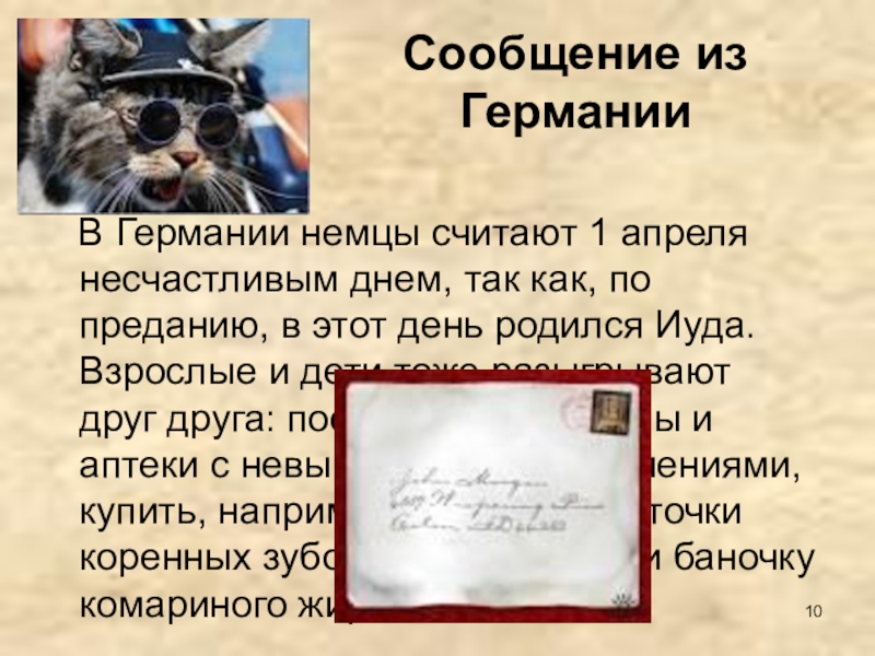 днем, так как, по преданию, в этот день родился Иуда. Взрослые и дети тоже разыгрывают друг друга: посылают в магазины и аптеки с невыполнимыми поручениями, купить, например, пилку для заточки коренных зубов или приобрести баночку комариного жира.