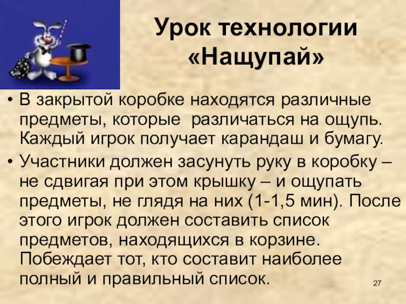 Участники должен засунуть руку в коробку – не сдвигая при этом крышку – и ощупать предметы, не глядя на них (1-1,5 мин). После этого игрок должен составить список предметов, находящихся в корзине. Побеждает тот, кто составит наиболее полный и правильный список.