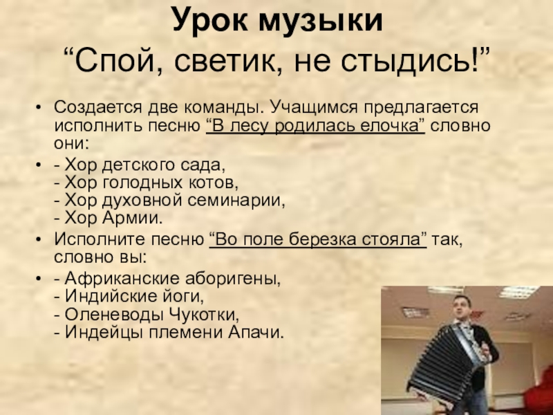 Исполните песню “Во поле березка стояла” так, словно вы: