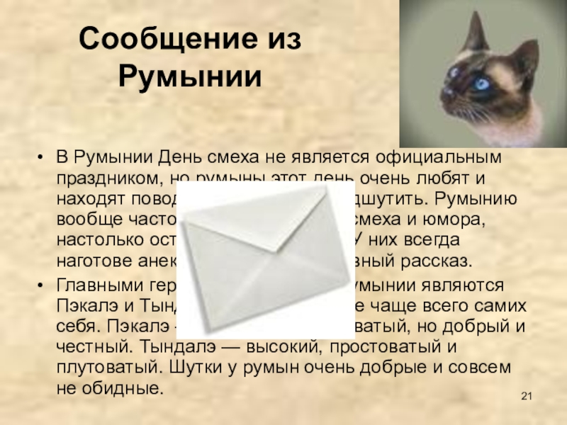 румыны этот день очень любят и находят повод над кем-нибудь подшутить. Румынию вообще часто называют страной смеха и юмора, настолько остроумны ее жители. У них всегда наготове анекдот, шутка или забавный рассказ.