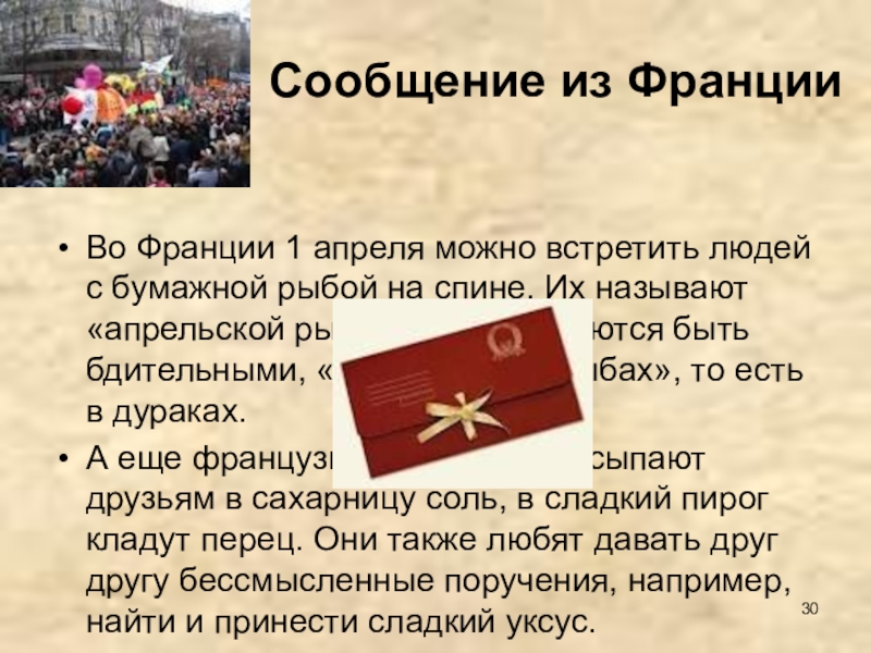 рыбой на спине. Их называют «апрельской рыбой». Все стараются быть бдительными, «не остаться в рыбах», то есть в дураках.