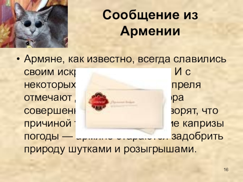 с некоторых пор в Армении 1 апреля отмечают День сатиры и юмора совершенно официально. Говорят, что причиной тому стали весенние капризы погоды — армяне стараются задобрить природу шутками и розыгрышами.
