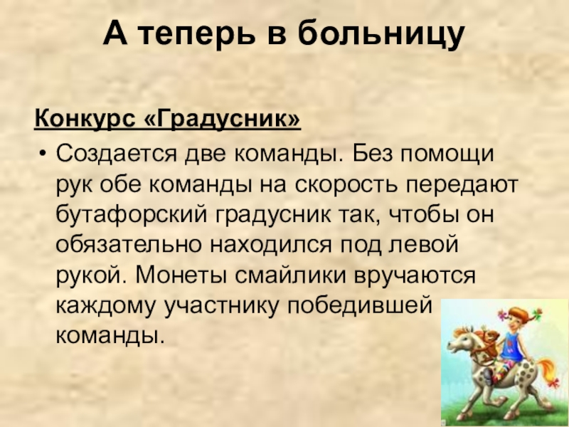 команды на скорость передают бутафорский градусник так, чтобы он обязательно находился под левой рукой. Монеты смайлики вручаются каждому участнику победившей команды.