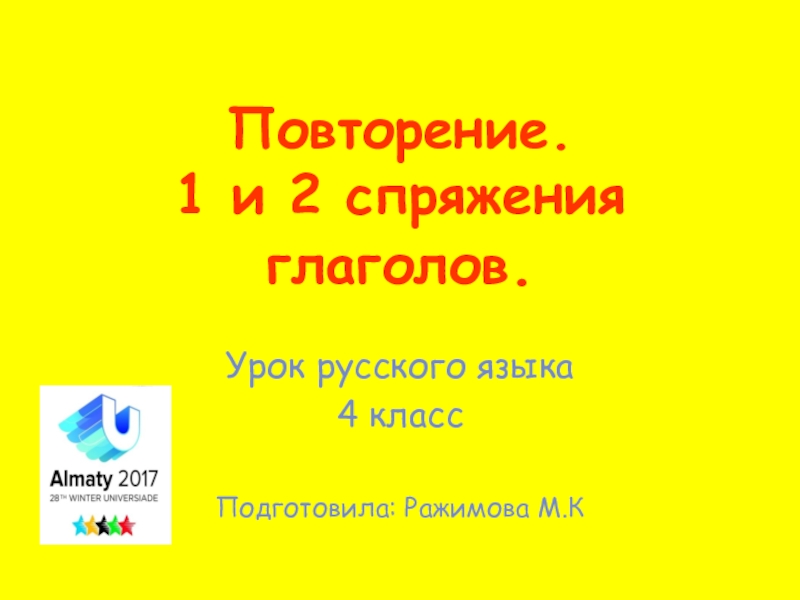 Повторение.  1 и 2 спряжения глаголов.Урок русского языка4 классПодготовила: Ражимова М.К