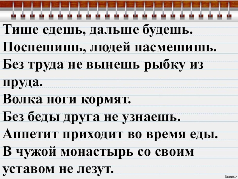 Тише едешь, дальше будешь.Поспешишь, людей насмешишь.Без труда не вынешь рыбку из пруда.Волка ноги кормят.Без беды друга не