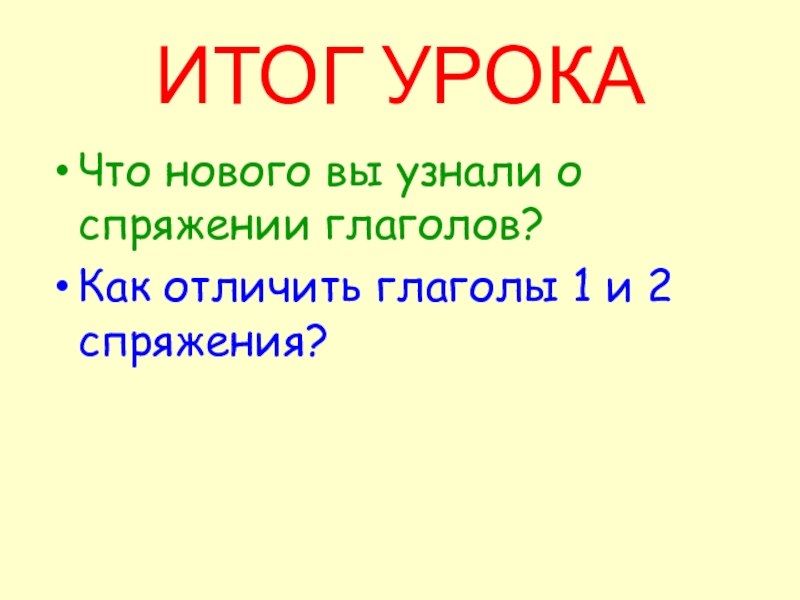 ИТОГ УРОКАЧто нового вы узнали о спряжении глаголов?Как отличить глаголы 1 и 2 спряжения?
