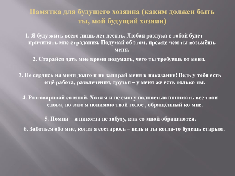 Слайд 19Памятка для будущего хозяина (каким должен быть ты, мой будущий хозяин)