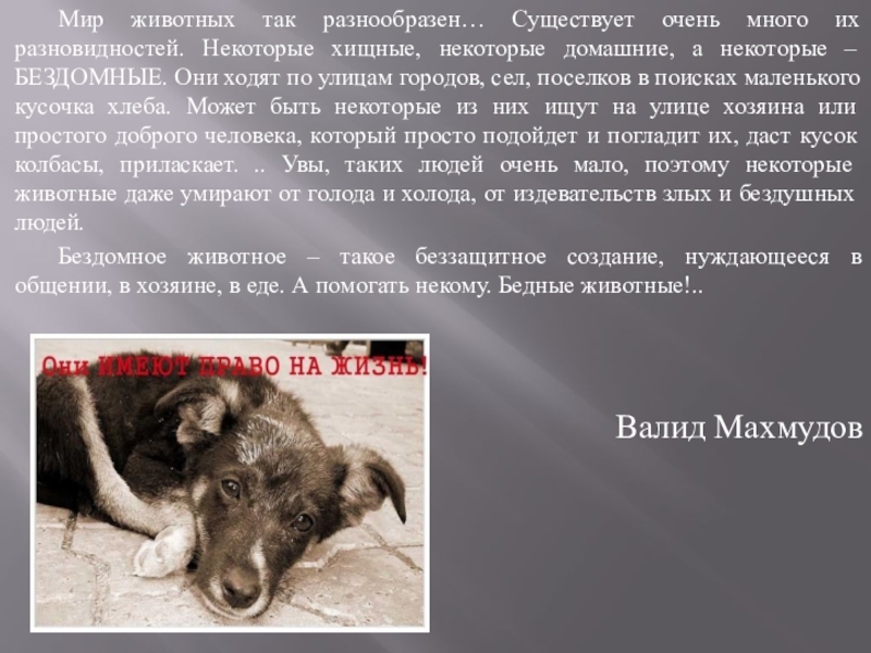 некоторые домашние, а некоторые – БЕЗДОМНЫЕ. Они ходят по улицам городов, сел, поселков в поисках маленького кусочка хлеба. Может быть некоторые из них ищут на улице хозяина или простого доброго человека, который просто подойдет и погладит их, даст кусок колбасы, приласкает. .. Увы, таких людей очень мало, поэтому некоторые животные даже умирают от голода и холода, от издевательств злых и бездушных людей.