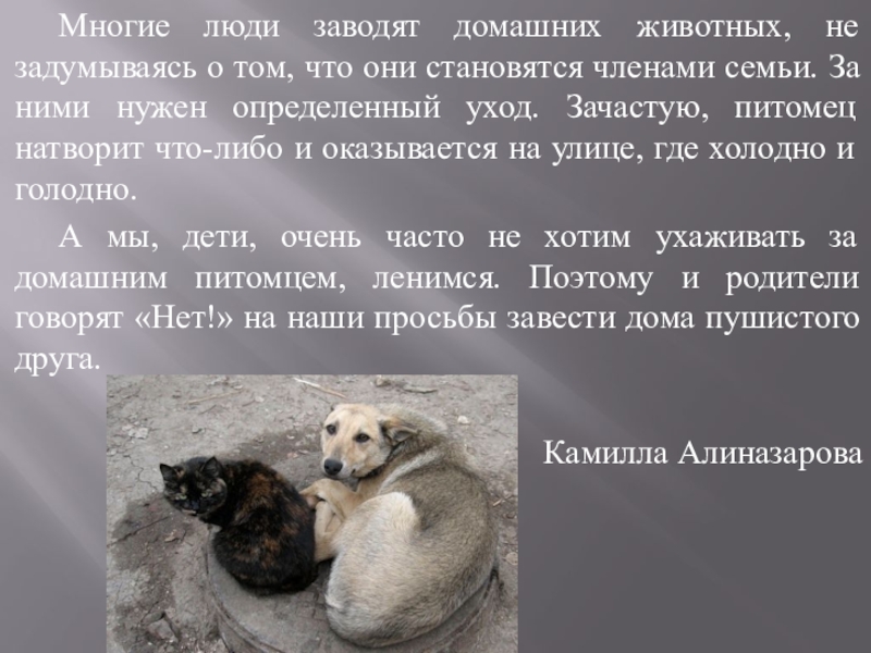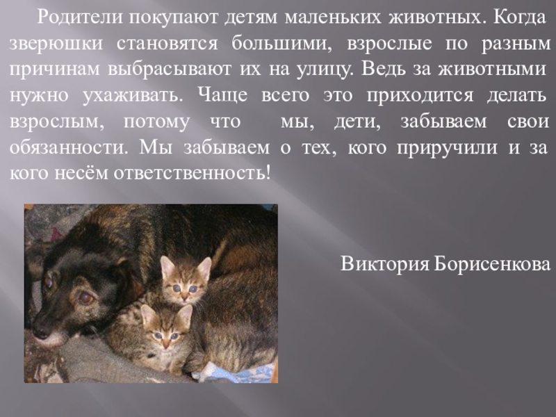 разным причинам выбрасывают их на улицу. Ведь за животными нужно ухаживать. Чаще всего это приходится делать взрослым, потому что мы, дети, забываем свои обязанности. Мы забываем о тех, кого приручили и за кого несём ответственность!