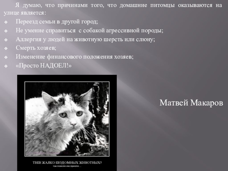 Слайд 12Я думаю, что причинами того, что домашние питомцы оказываются на улице