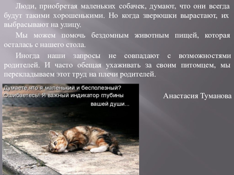 людей. Наигравшись с маленьким и забавным малышом, хозяева понимают, что это ещё ответственность и труд. Некоторые не готовы к этому и выбрасывают животное на улицу. Я считаю, что самой большой помощью является поиск хозяина, настоящего и ответственного!