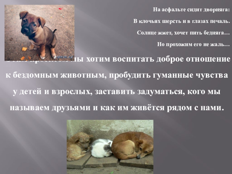 Этим проектом мы хотим воспитать доброе отношение к бездомным животным, пробудить гуманные чувства у детей и взрослых, заставить задуматься, кого мы называем друзьями и как им живётся рядом с нами.