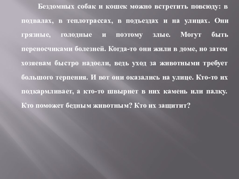 в подвалах, в теплотрассах, в подъездах и на улицах. Они грязные, голодные и поэтому злые. Могут быть переносчиками болезней. Когда-то они жили в доме, но затем хозяевам быстро надоели, ведь уход за животными требует большого терпения. И вот они оказались на улице. Кто-то их подкармливает, а кто-то швырнет в них камень или палку. Кто поможет бедным животным? Кто их защитит?