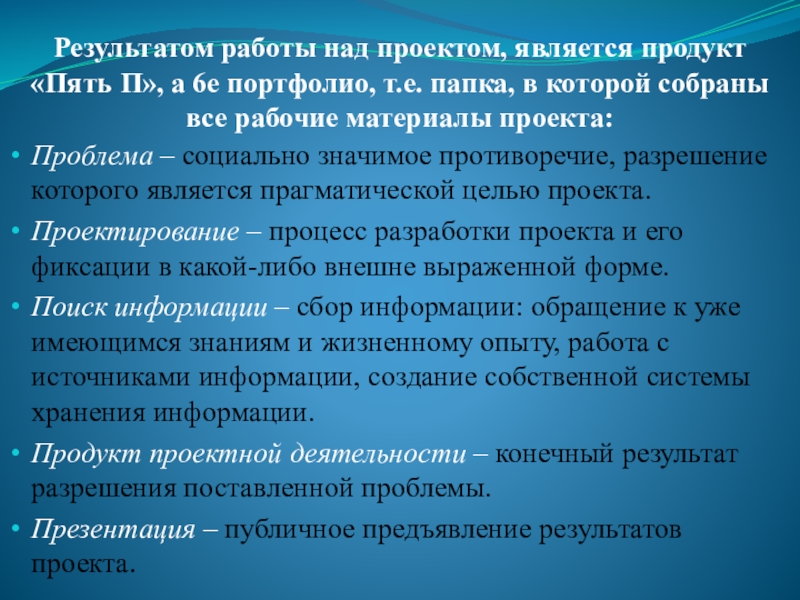 Результатом работы над проектом, является продукт «Пять П», а 6е портфолио, т.е. папка, в которой собраны все рабочие материалы проекта: