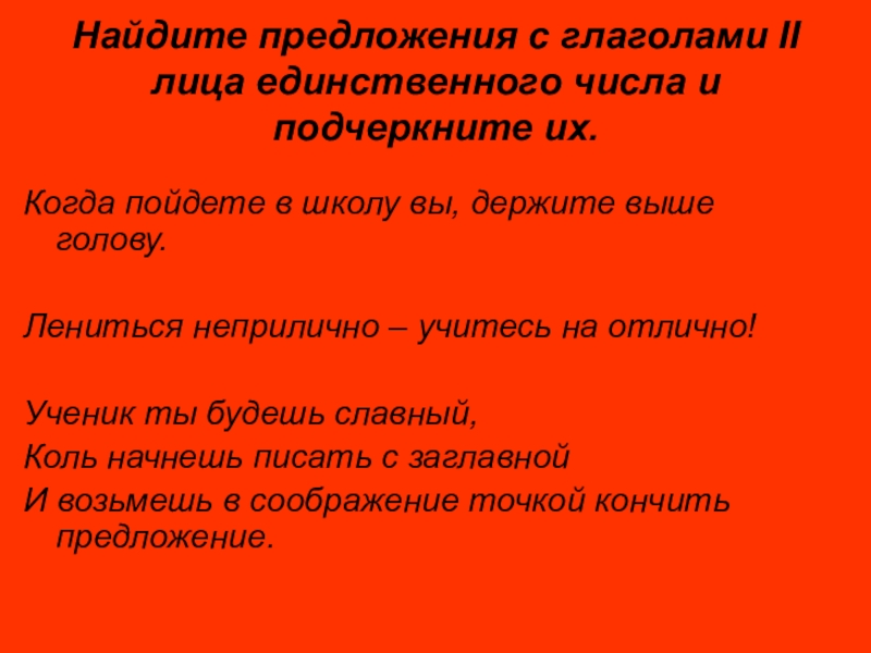 Найдите предложения с глаголами II лица единственного числа и подчеркните их.Когда пойдете в школу вы, держите выше
