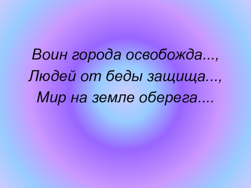 Воин города освобожда...,Людей от беды защища...,Мир на земле оберега....