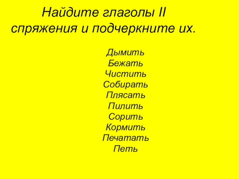 Найдите глаголы II спряжения и подчеркните их.ДымитьБежатьЧиститьСобиратьПлясатьПилитьСоритьКормитьПечататьПеть