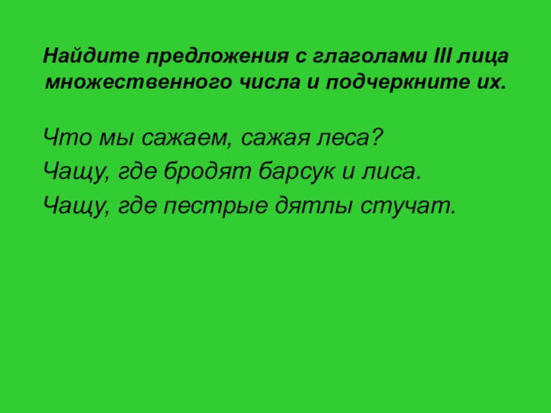 Найдите предложения с глаголами III лица множественного числа и подчеркните их.Что мы сажаем, сажая леса?Чащу, где бродят