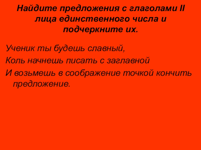 Слайд 17Найдите предложения с глаголами II лица единственного числа и подчеркните их.