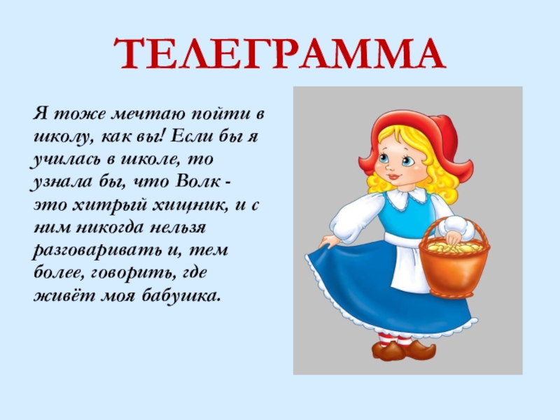 училась в школе, то узнала бы, что Волк - это хитрый хищник, и с ним никогда нельзя разговаривать и, тем более, говорить, где живёт моя бабушка.
