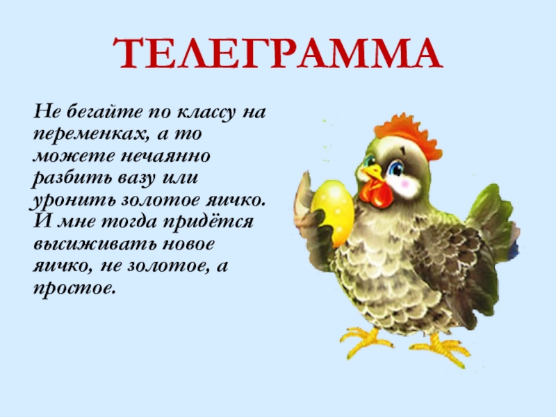 ТЕЛЕГРАММАНе бегайте по классу на переменках, а то можете нечаянно разбить вазу или уронить золотое яичко. И