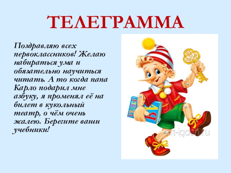 ТЕЛЕГРАММАПоздравляю всех первоклассников! Желаю набираться ума и обязательно научиться читать. А то когда папа Карло подарил мне