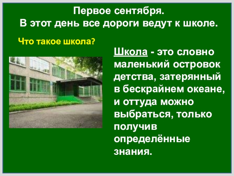 Школа - это словно маленький островок детства, затерянный в бескрайнем океане, и оттуда можно выбраться, только получив определённые знания.
