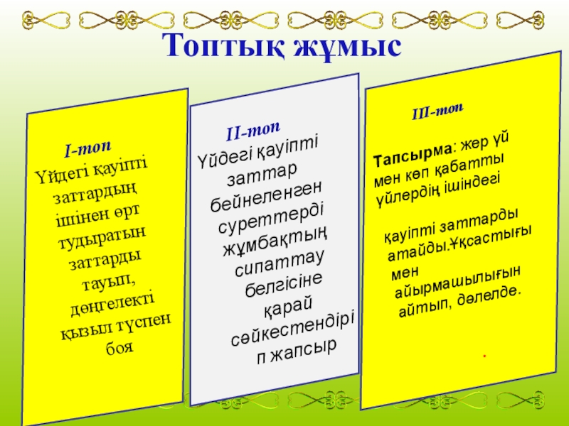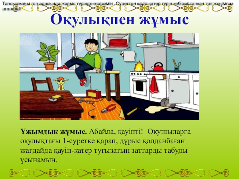 Тапсырманы топ арасында жарыс түрінде өткіземін . Суреттен қауіп-қатер түрін көбірек тапқан топ жеңімпаз атанады.