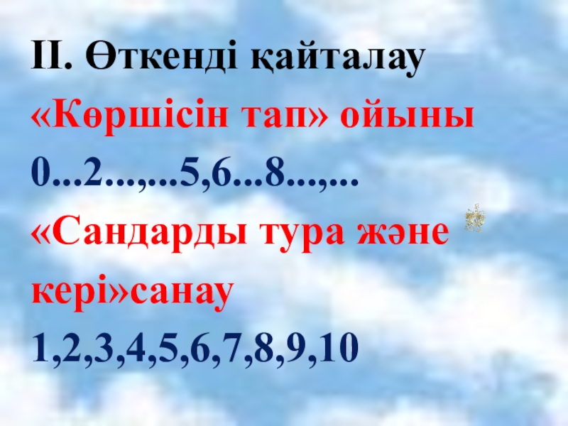 ІІ. Өткенді қайталау«Көршісін тап» ойыны 0...2...,...5,6...8...,... «Сандарды тура және кері»санау 1,2,3,4,5,6,7,8,9,10