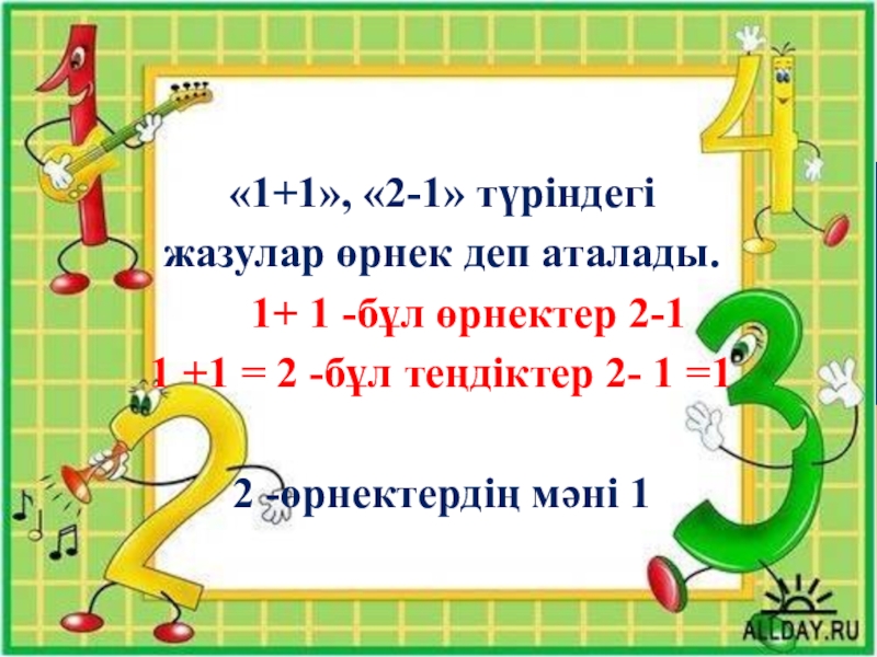 «1+1», «2-1» түріндегі жазулар өрнек деп аталады.   1+ 1 -бұл өрнектер 2-1 1 +1 =