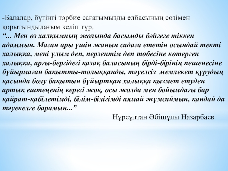 Елбасының өмірін, еңбек жолын үлгі-өнеге ете отырып, патриоттық сезімдерін арттыру.