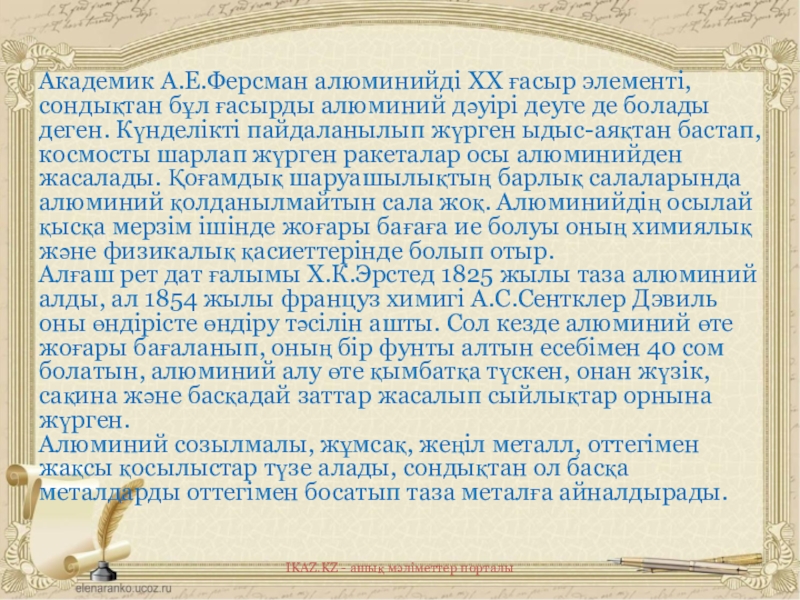 Слайд 17Академик А.Е.Ферсман алюминийді ХХ ғасыр элементі, сондықтан бұл ғасырды алюминий дәуірі