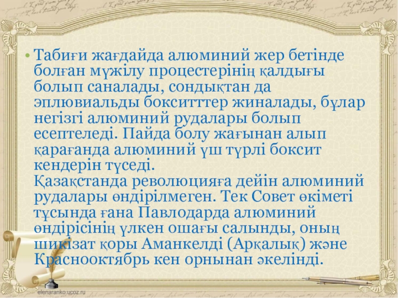 Слайд 22Табиғи жағдайда алюминий жер бетінде болған мүжілу процестерінің қалдығы болып саналады,