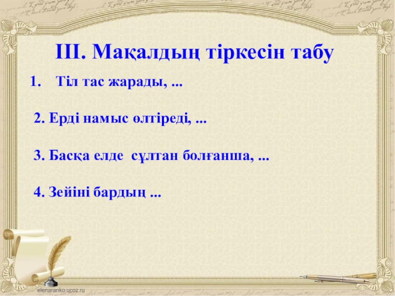 Слайд 5ІІІ. Мақалдың тіркесін табу