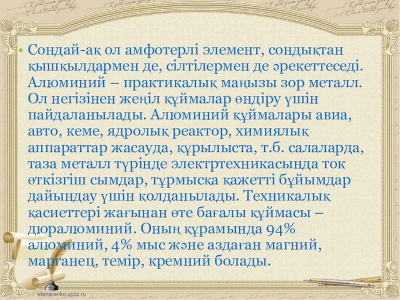 Слайд 16Сондай-ақ ол амфотерлі элемент, сондықтан қышқылдармен де, сілтілермен де әрекеттеседі. Алюминий