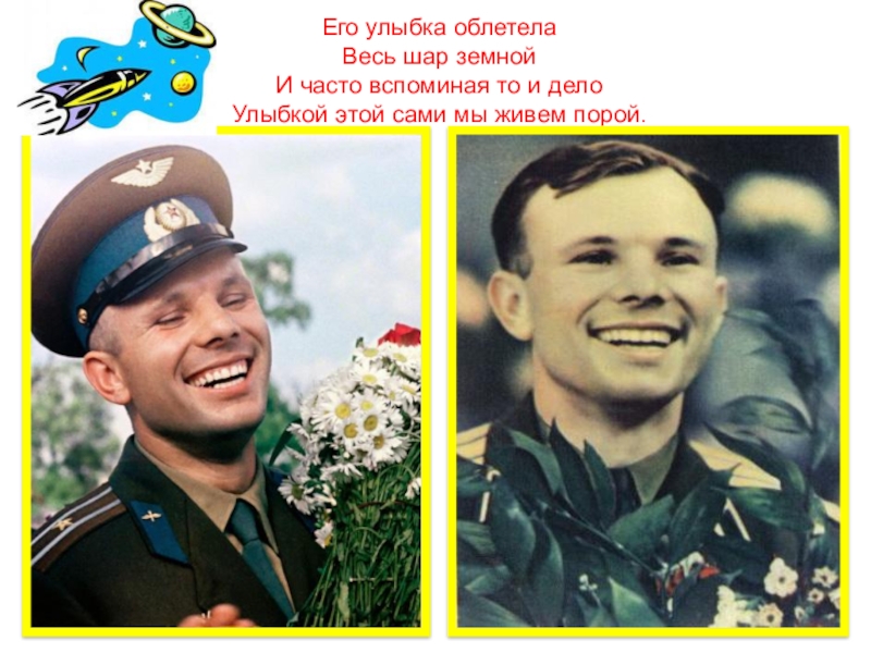 Слайд 7 Его улыбка облетела Весь шар земной И часто вспоминая то и дело Улыбкой этой