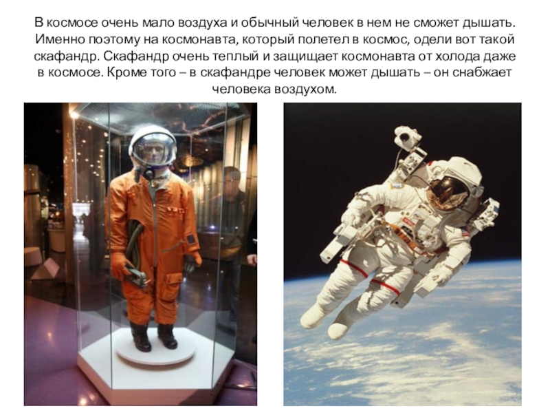 сможет дышать. Именно поэтому на космонавта, который полетел в космос, одели вот такой скафандр. Скафандр очень теплый и защищает космонавта от холода даже в космосе. Кроме того – в скафандре человек может дышать – он снабжает человека воздухом.