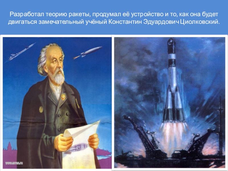 Разработал теорию ракеты, продумал её устройство и то, как она будет двигаться замечательный учёный Константин Эдуардович Циолковский.