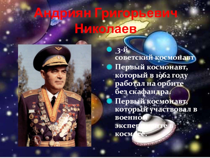 Андриян Григорьевич Николаев 3-й советский космонавтПервый космонавт, который в 1962 году работал на орбите без скафандра.Первый космонавт, который участвовал в