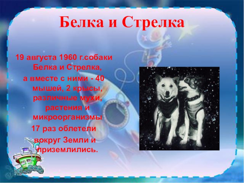 Белка и Стрелка 19 августа 1960 г.собаки Белка и Стрелка, а вместе с ними - 40 мышей,