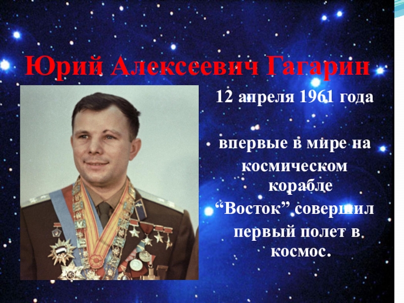 Юрий Алексеевич Гагарин12 апреля 1961 годавпервые в мире накосмическом корабле“Восток” совершил первый полет в космос.