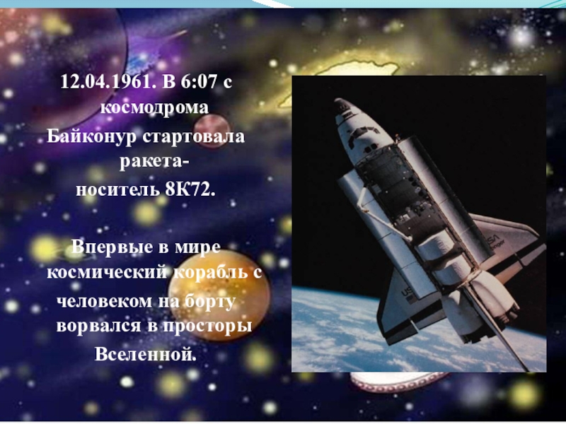 12.04.1961. В 6:07 с космодромаБайконур стартовала ракета-носитель 8К72.Впервые в мире космический корабль счеловеком на борту ворвался в