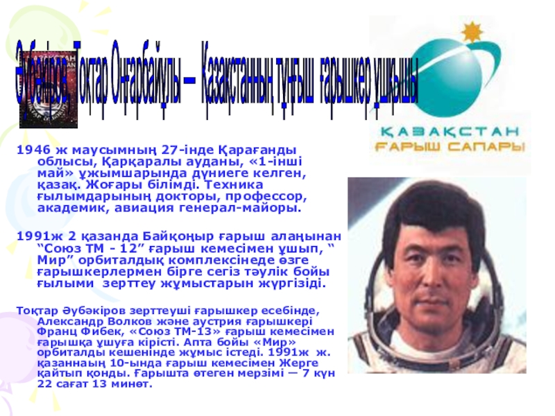 Әубәкіров, Тоқтар Оңғарбайұлы — Қазақстанның тұңғыш ғарышкер ұшқышы